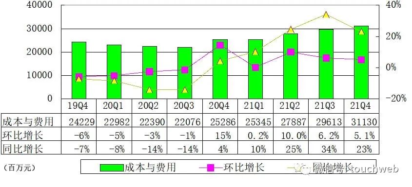 百度2021年第四季度成本与费用为311亿元,较上年同期的252亿元增长23%。