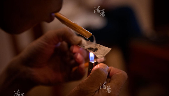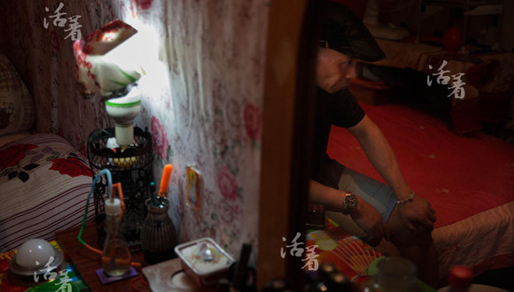 12. 小东北在房间里抽“4号”(俗称白粉),有钱的时候一天抽5,6次,没钱的时候早晚各一次。他已是冰毒和海洛因的双重重度依赖者。33岁的小东北来自辽宁抚顺的一个单亲家庭,15岁辍学,19岁在当地混黑社会,23岁开始接触毒品。2010年他带着8000多块来到果敢,一周输光,之后开始居无定所的生活。2015年果敢军事冲突期间,差点被炸弹炸死。他说,“我已经回不去了。我戒不了毒,回去也是偷抢。”