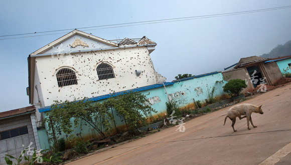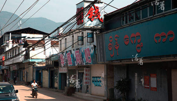 14. 老街的一栋房屋墙面上布满弹孔,小东北曾经在这旁边的一栋楼里躲了一个晚上,炮弹就在门口爆炸,他亲眼目睹了3、4个人被击毙在路边。据当地人介绍,2015年打仗的时候,这是当地一个家族军阀的指挥所,在这一带,同盟军与缅军发生激烈冲突。至今周边很多房屋还是空的。