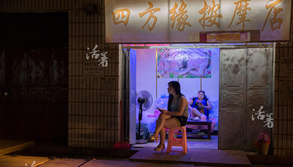 11. 在“鸡街”,一个性工作者坐在门口。这里的性服务店都是公开化,姑娘们大多来自本地。打仗之后,老街实行宵禁,给性服务行业带来一定的打击,早上10点多,她们就开门接客。