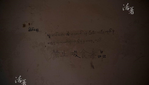 6. 阿甘家墙壁上写着警告。事实上,吸毒对他来说已经是无法戒断的瘾。这里的小麻价格不到国内的五分之一,海洛因价格则是二十分之一,很多吸毒者每天掏几十块钱就可以勉强度过。当地政府在13年前已大力推广禁毒,但是屡禁不止,抽小麻的人在当地大量存在。