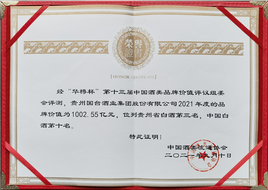 无独有偶,中国酒类流通协会发布的“第13届华樽杯中国酒类品牌价值200强研究报告”中,国台酒业品牌价值突破千亿,并上升两名进入了前十名。