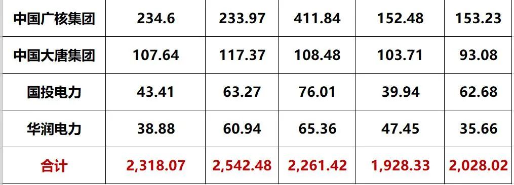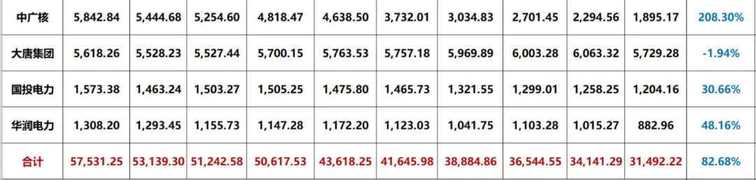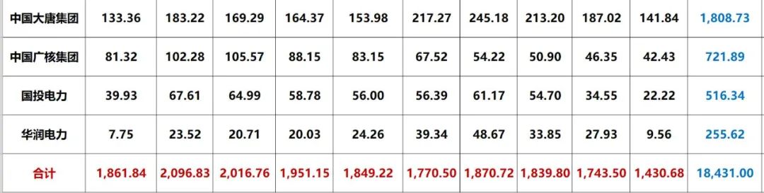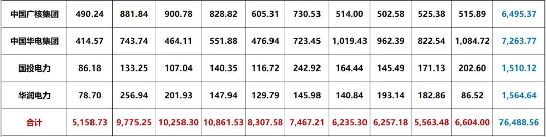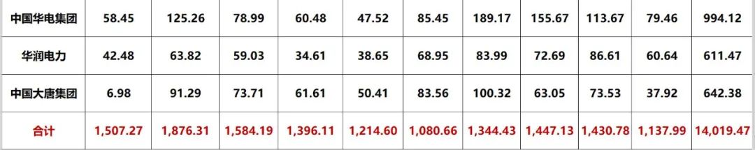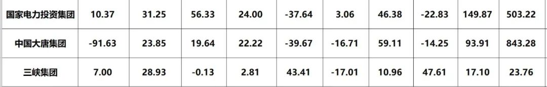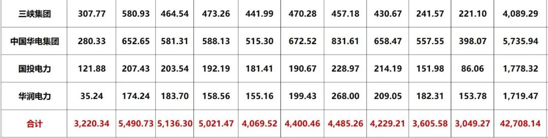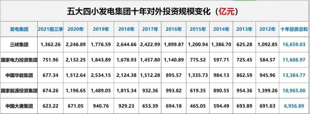 同时,近十年五大四小发电集团合计对外投资7.65万亿。其中,三峡集团、国家电力投资集团、中国华能集团、国家能源投资集团年度对外投资规模均突破1000亿元。