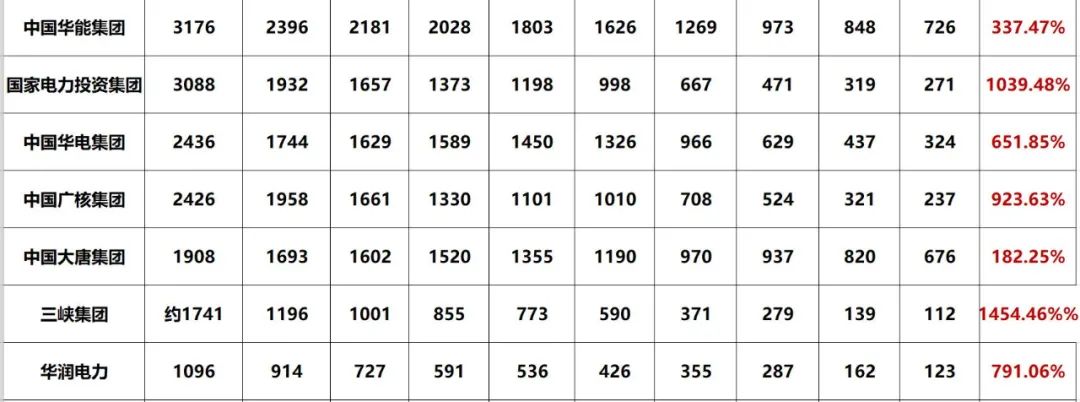 从增速看,十年间有五家发电集团总装机容量增长在100%以上,中国广核集团和三峡集团分别以470.87%和200%的涨幅位列一二位。