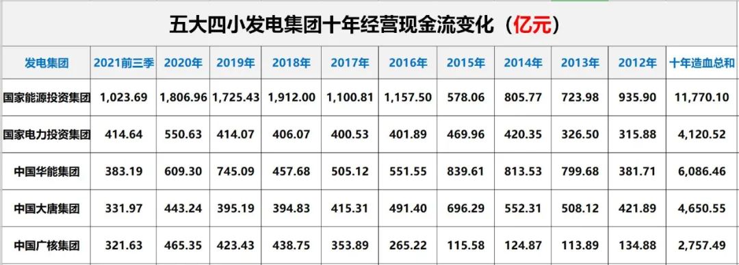 近十年间,五大四小发电集团合计造血(经营现金流净额)4.27万亿元,其中国家能源投资集团合计造血1.18万亿,造血力高居第一位。