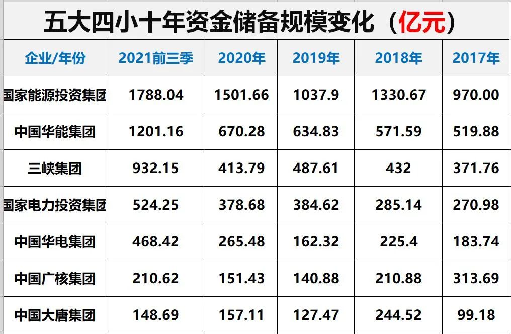 近十年间,五大四小发电集团的资金储备从2028亿元增长至5405亿元,增长近166.53%。截止2021年9月末,7大发电集团资金储备规模都在100亿元以上,国家能源投资集团和中国华能集团资金储备规模均超1000亿元。
