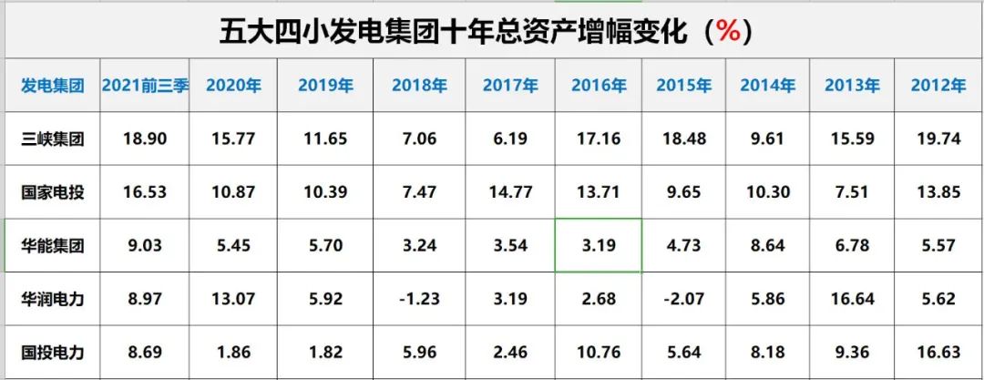 从增速看,其中7大发电集团总资产都已超10年以上持续增长;十年间4大发电集团总资产规模增长在100%以上,依次为中国广核集团,总资产增长216.43%;三峡集团,总资产增长200.78%;国家电力投资集团,总资产增长155%;国家能源投资集团,总资产增长128.38%。