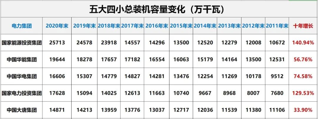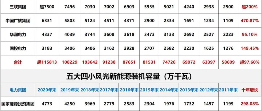据黑鹰光伏统计,2011年-2020年这十年间五大四小发电集团总装机容量从5.86亿千瓦增长至11.58亿千瓦,十年增长了97.60%。其中五大发电集团总装机容量均突破1亿千瓦。