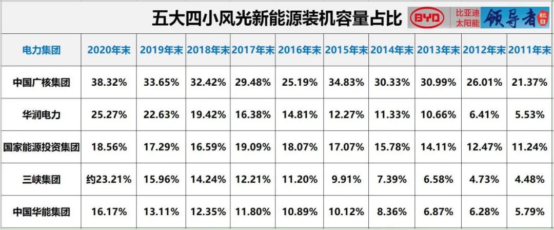 此外,十年间,五大四小发电集团新能源装机容量占比已从2011年末的6.34%增长至2020年末的18.10%,其中8家发电集团新能源装机容量占比均超10%,前三名依次为中国广核集团,占比为38.32%;华润电力,占比25.27%;三峡集团,占比约23.21%。