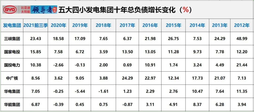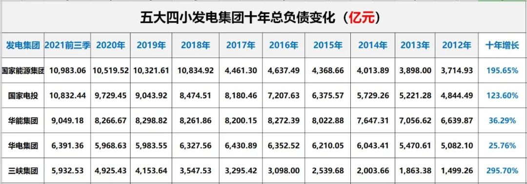 十年间,只有中国大唐集团总负债为负增长,4家发电集团总负债增长在100%以上,依次为三峡集团,总负债增长295.70%;中国广核集团,增长208.30%;国家能源投资集团,增长195.65%;国家电力投资集团,增长123.60%。