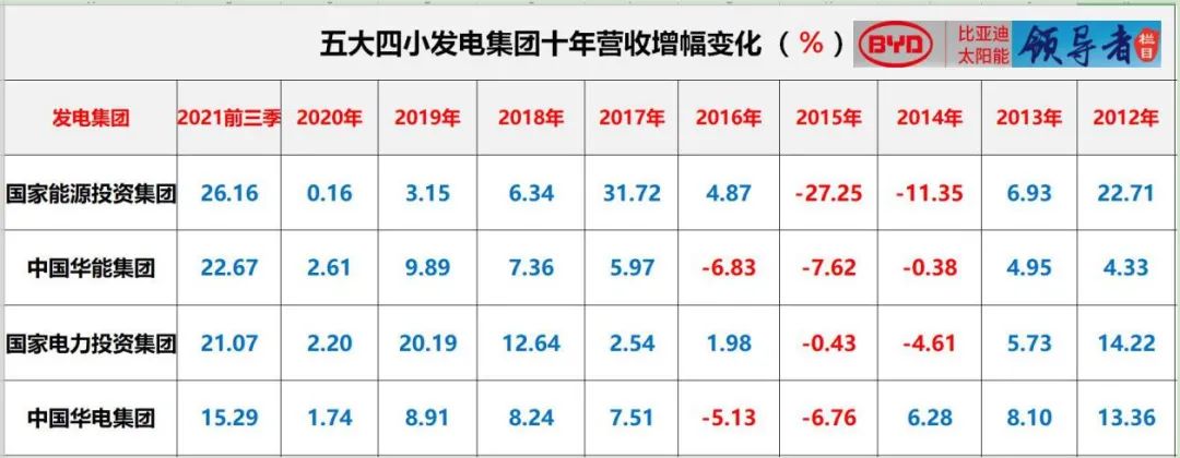 据黑鹰光伏统计,近十年间(2012年-2021年前三季度),五大四小发电集团合计创收15.21万亿元,其中4家发电集团总营收突破1万亿元,依次为国家能源投资集团,总创收3.99万亿;中国华能集团,总创收2.81万亿;国家电力投资集团,总创收2.16万亿;中国华电集团,总创收2.07万亿;中国大唐集团,总创收1.79万亿。从增速看,其中7大发电集团营收连续五年实现正增长,三峡集团和中国广核集团实现超10年正增长。