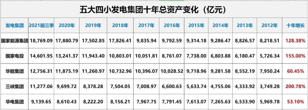 截止2021年9月末,五大四小发电集团总资产合计为8.74万亿元,较十年前增长近1倍。其中,国家能源投资集团、国家电力投资集团、中国华能集团、三峡集团总资产规模均超万亿。