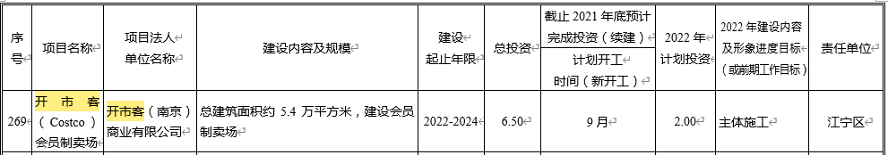 在近期发布的《南京市2022年经济社会发展重大项目计划的通知》中,我们发现开市客也“榜上有名”。根据文件表述,开市客的建设起止年限为2022-224年,计划今年9月开工建设,直至2022年预计将完成主体施工部分。