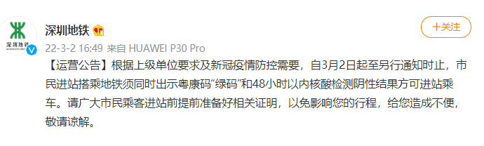 @深圳地铁 微博消息,根据上级单位要求及新冠疫情防控需要,自3月2日起至另行通知时止,市民进站搭乘地铁须同时出示粤康码“绿码”和48小时以内核酸检测阴性结果方可进站乘车。请广大市民乘客进站前提前准备好相关证明,以免影响您的行程,给您造成不便,敬请谅解。