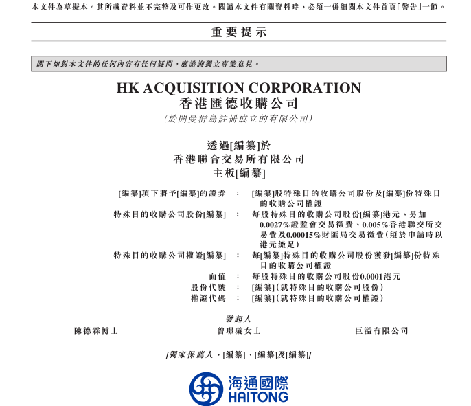 港交所披露易显示,香港汇德收购公司(简称汇德公司)向港交所主板递交上市申请,海通国际为独家保荐人。值得一提的是,这第八家SPAC公司背后的发起人是前香港金融局总裁陈德霖。