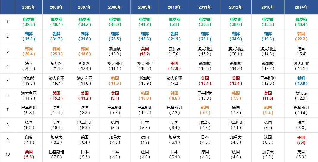 表:2005-2014年中国城市公众认为对中国最友好的国家(%)