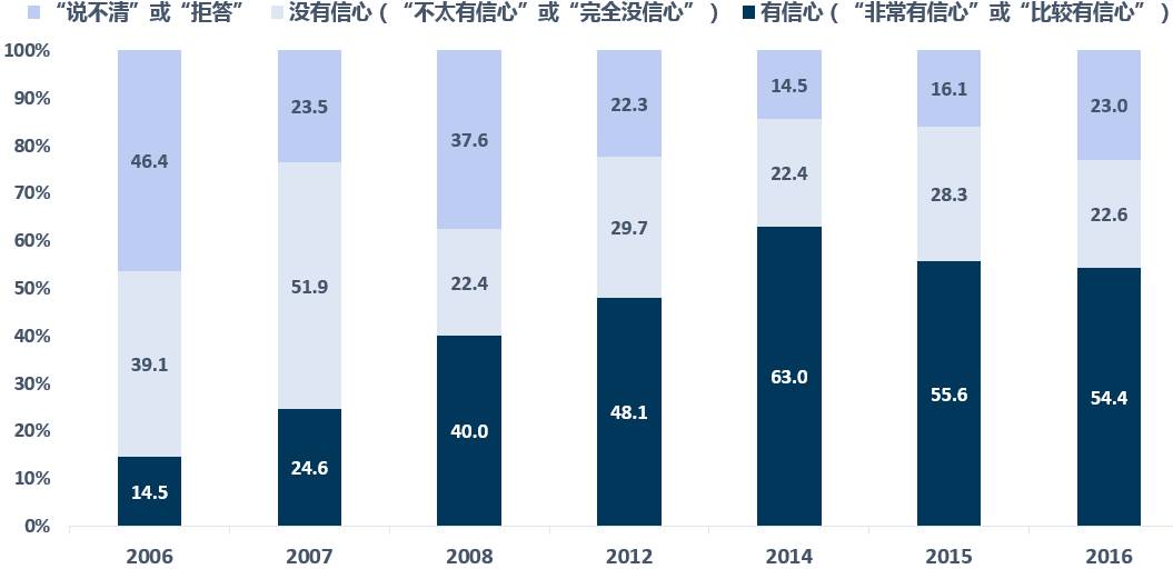 整体来看,2014年前中国公众对俄罗斯总统普京正确处理国际事务的信心度呈现迅速上升趋势(2006年,14.5%;2008年,40%;2014年,63%)。此后,这一信心度虽有所下降,但仍维持在半数以上的较高水平。
