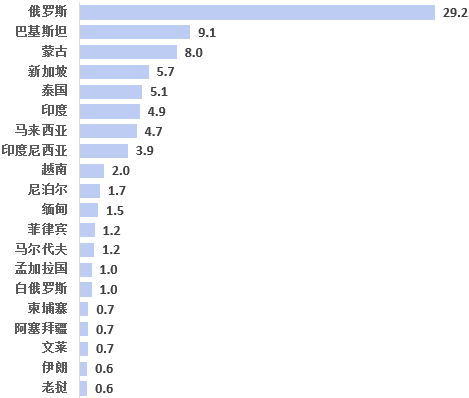 中国公众认为,俄罗斯将是“一带一路”这项全球倡议的最大受益者。近三成中国城市受访者(29.2%)认为俄罗斯将在“一带一路”中获益最大,这一比例远高于排在第二、三位的巴基斯坦和蒙古(9.1%和8%)。前十名的其他国家均为东南亚、南亚地区的海上丝绸之路沿线国家。