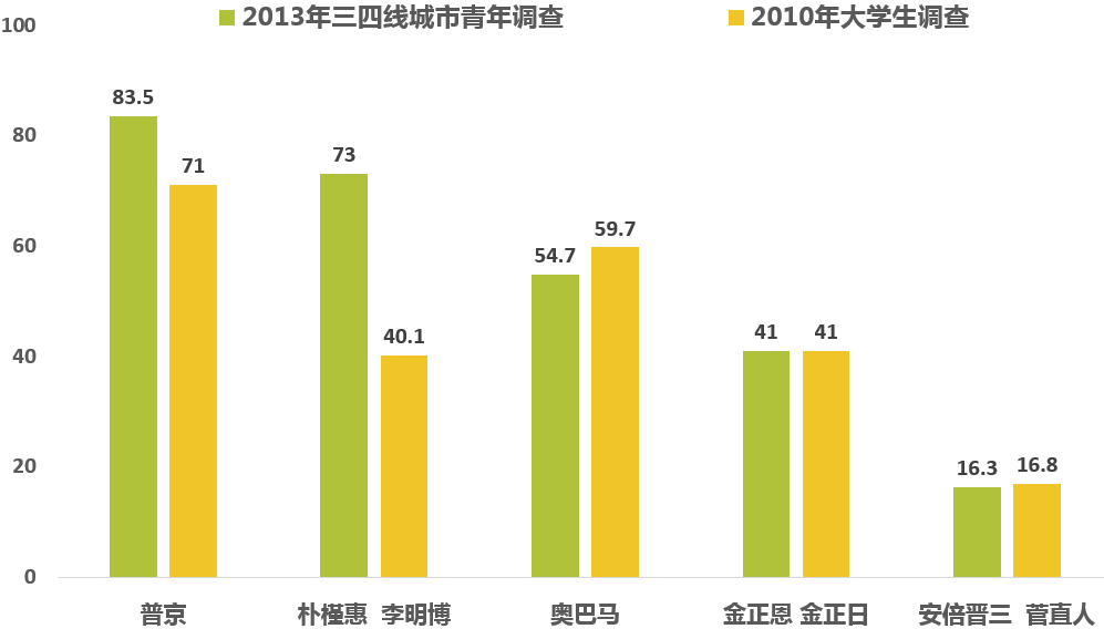 2010和2013年零点国际关系事业部相关调查结果显示,在美国、俄罗斯、韩国、朝鲜和日本五国领导人中,中国青年最欣赏普京。