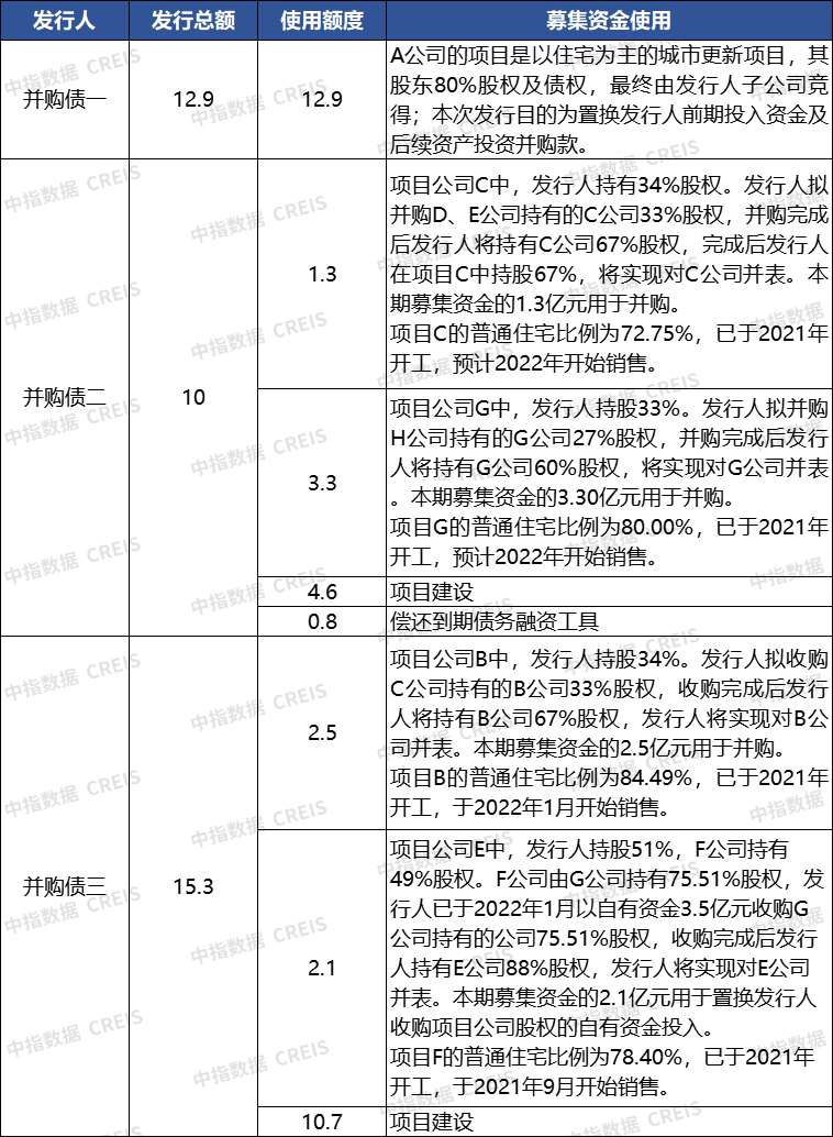 从并购对象来看,通过企业前期披露的信息可知,债券一的交易对手为地方国企的城市更新项目。债券二、三均为从共同开发项目的其他股东手中收购,对象仅限于合作方,并未惠及第三方房企;且涉及的项目均是按期开工、推进顺利,并于近期开盘,存在有其他股东协议到期退出的嫌疑。