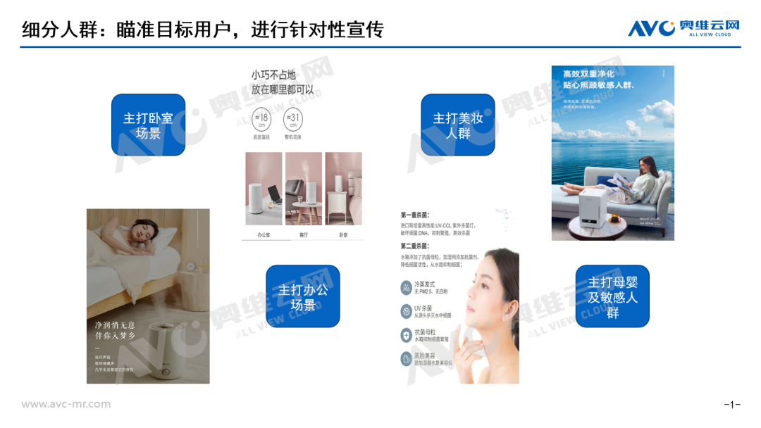 在产品宣传方面,可以充分宣传加湿器对健康的有益作用。目前,产品宣传主要集中在“人体感觉最为舒适的室内湿度是40%~60%”。而对于这一湿度可以减少病菌的传播这一功效宣传甚少。完全可以通过这方面宣传,精准营销对生活品质要求较高的人群。另外,湿润的空气可以使皮肤细腻,起到美容的作用,同样可以针对护肤美妆人群,推出定制化产品进行针对性营销。其他,像针对加湿器主要应用的卧室场景,可以宣传静音,针对白领的办公场景,宣传小巧,针对母婴人群,宣传安全、健康等等。同时,让消费者充分了解湿度过低的健康风险,提升消费者的购买欲望,或充分发挥自家产品的某项优势(如加热、除菌、纯净加湿等),吸引对应人群,最终实现购买。
