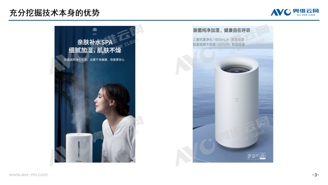 在产品功能方面,针对不同的加湿技术,应使用不同的优化思路,如针对超声波加湿器,应充分发挥“有雾”的优势,可以打出热雾+SPA等宣传卖点,瞄准对面部保湿有温度要求的护肤族,从而实现产品的溢价。而纯净型加湿器,则可以着重宣传产品本身“无雾”的优势,如模拟自然蒸发的加湿方式、可以直接使用自来水、无水雾,无“白粉”、不会打湿地面、不会将水中的钙镁离子带入空气中等产品优势。解决消费者使用时的大部分后顾之忧的同时,满足他们的健康需求。