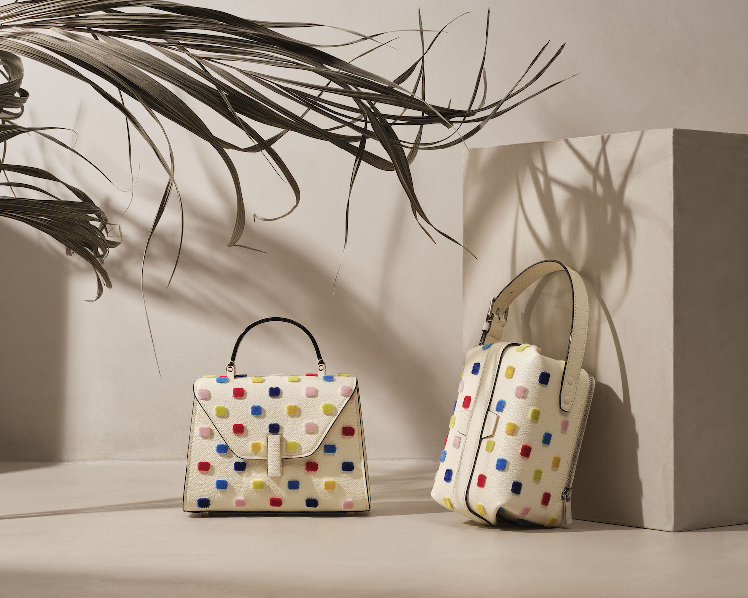 NoLo斜挎包由品牌标志性的Millepunte小牛皮制成,以日常实用为设计概念,设有双隔层及多个方便取用的口袋,搭配牢固耐用的斜挎肩带,扭锁设计灵感源自品牌1950年代的经典作品;Iside手袋和Tric Trac Viso手袋通过抽象拼接图案诠释出Intarsia手工皮革嵌花工艺的精妙魅力。包身以Millepunte小牛皮制成,撞色设计洋溢活泼气息,经典羊皮纸白色和工业风灰色与明快的海蓝色、黄色、芍药红和泡泡糖粉色相映成趣。