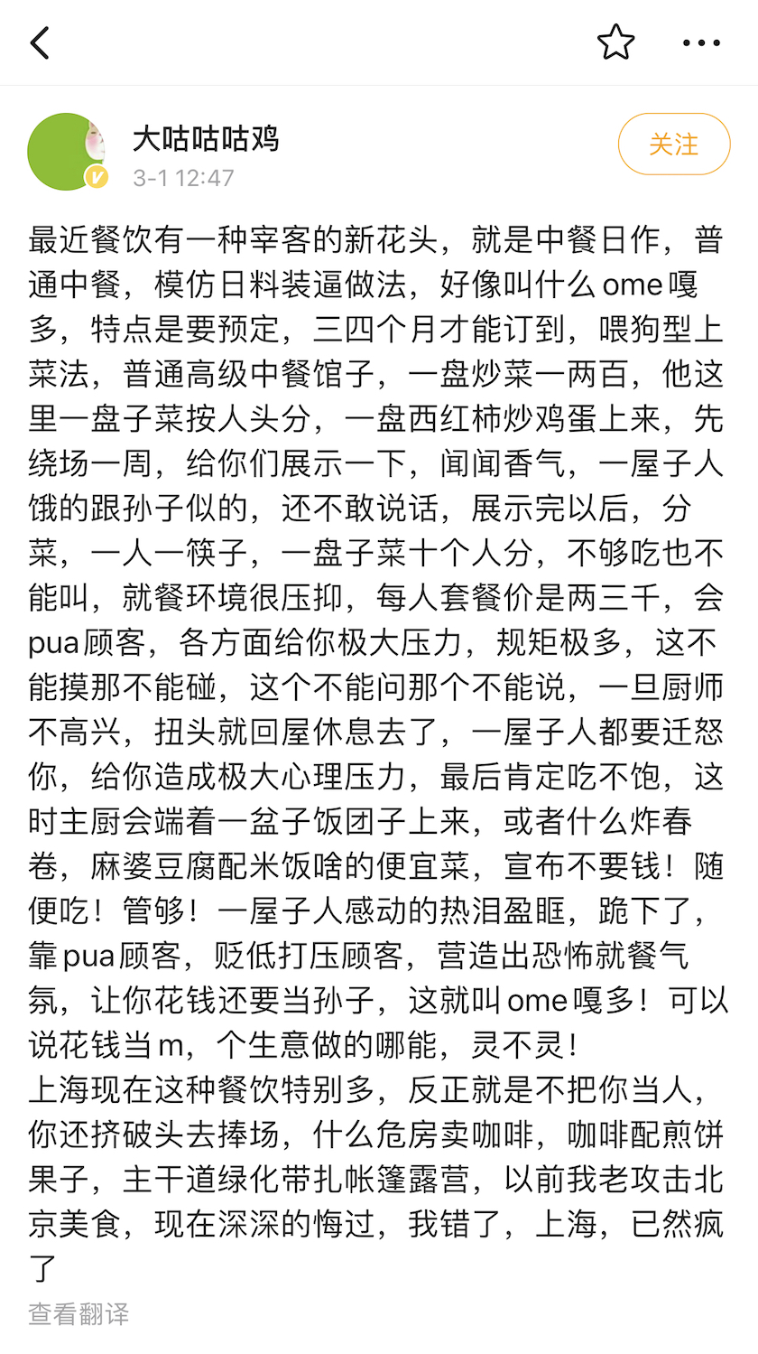 人均2000、“喂狗型上菜”、“恐怖就餐气氛”,社交平台上一位网友针对上海某新开餐厅“中餐日做”的吐槽火了。中餐日做指的是该餐厅以日本Omakase的呈现形式来做中国菜,而上述网友的吐槽直指其就餐环境压抑、且吃不饱。这似乎引发了许多共鸣,截至发稿这条微博已有近20万点赞,500多条评论,小红书等社交平台也开始随之发酵。