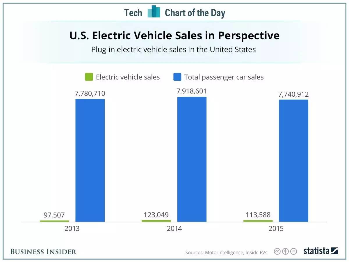 2013-2015年美国电动车和所有乘用车销售数据对比