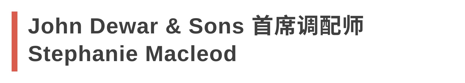 1998年,Stephanie Macleod加入了杜瓦公司格拉斯哥公司总部的烈酒质量实验室,由此开始了她的威士忌之旅。在经过四年的研究工作之后,Macleod加入了Dewar's的质检岗位。随着时间的推移和专业能力的提升,MacLeod于2006年接任帝王威士忌第7任“调和大师”,成为该品牌170年历史中首位担任这一角色的女性。2019 年,担任Dewar’s首席调酒师的Stephanie Macleod成为第一位在国际威士忌大赛 (IWC) 中获得年度调酒大师奖的女性,由此创下记录。