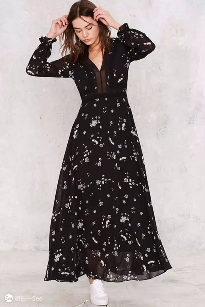黑色的碎花长裙有别致的优雅感。
