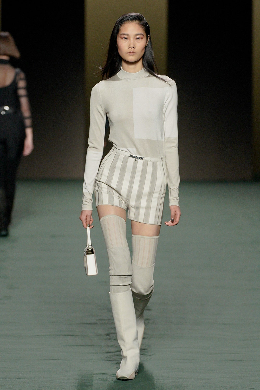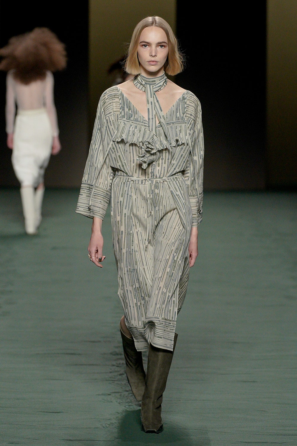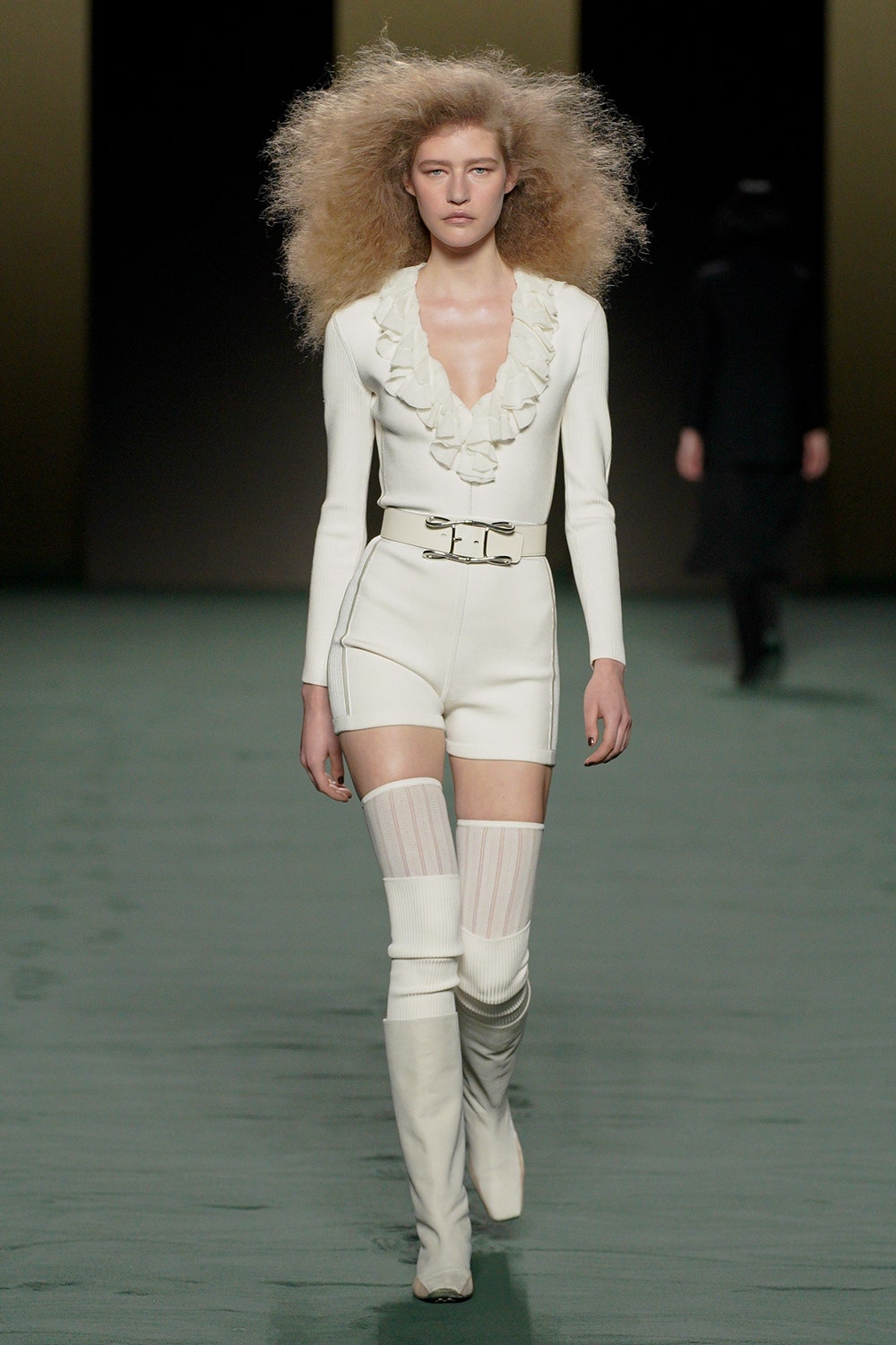 模特们踏着轻盈步伐,身着透明肤感紧身针织衫前行,腰间链条隐隐作响,行走间发出如铃铛般的清脆韵律,画面渐渐浮现眼前,如古老技艺与未来时光的重合,为成衣展现一种全新的马术风格。米白色荷叶边衣领丝质紧身连衣裤,酷雅别致,主张女性遵从自我规则行事,无需依于他人,时刻保持为明天制造惊喜的冲动。