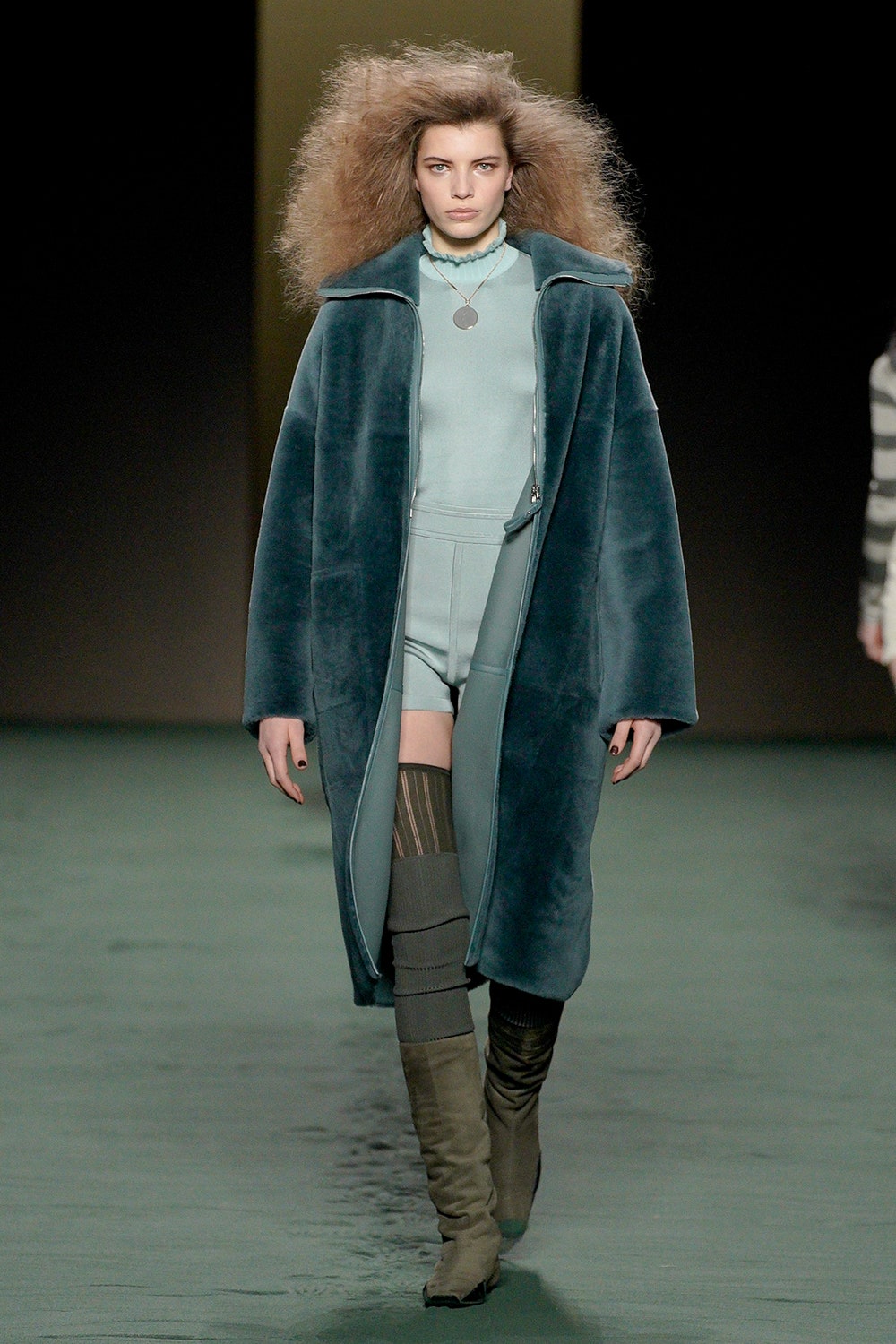 几款大衣在模特身上显现出品牌的华美格调,尤其是宽松苔藓蓝羊皮双面大衣,独有的蓝色可以窥得设计师以强大创作激情呈现出的古典时尚感,加之面料选择上的巧思,让整体更加轻盈。爱马仕FW22女装致力于唤起女性对天马行空的奇思妙想,或特立独行,或归属群体地追寻永恒色彩。芭蕾裙领陶瓷蓝色连体衣轻裹空灵身影,仿若囿于时间的穿梭者,强烈暗示打破常规的大胆精神。