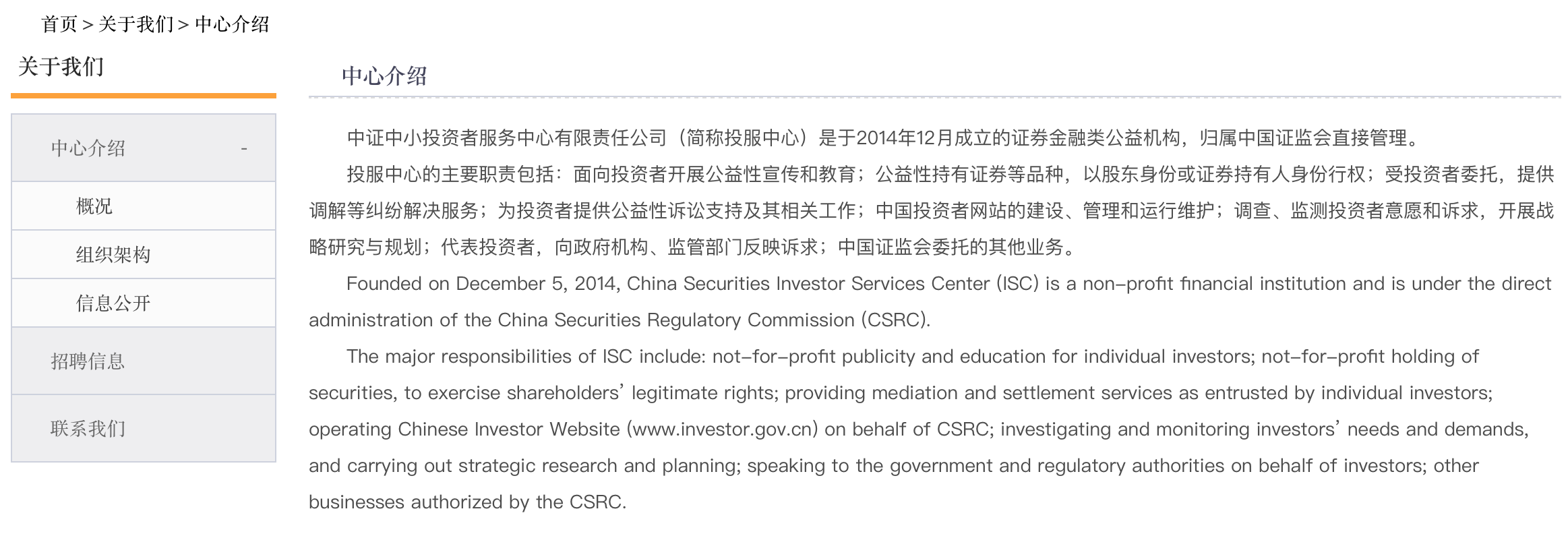 官方网站显示,投服中心是于2014年12月成立的证券金融类公益机构,归属中国证监会直接管理。投服中心的主要职责包括:面向投资者开展公益性宣传和教育;公益性持有证券等品种,以股东身份或证券持有人身份行权;受投资者委托,提供调解等纠纷解决服务;为投资者提供公益性诉讼支持及其相关工作;中国投资者网站的建设、管理和运行维护;调查、监测投资者意愿和诉求,开展战略研究与规划;代表投资者,向政府机构、监管部门反映诉求;中国证监会委托的其他业务。