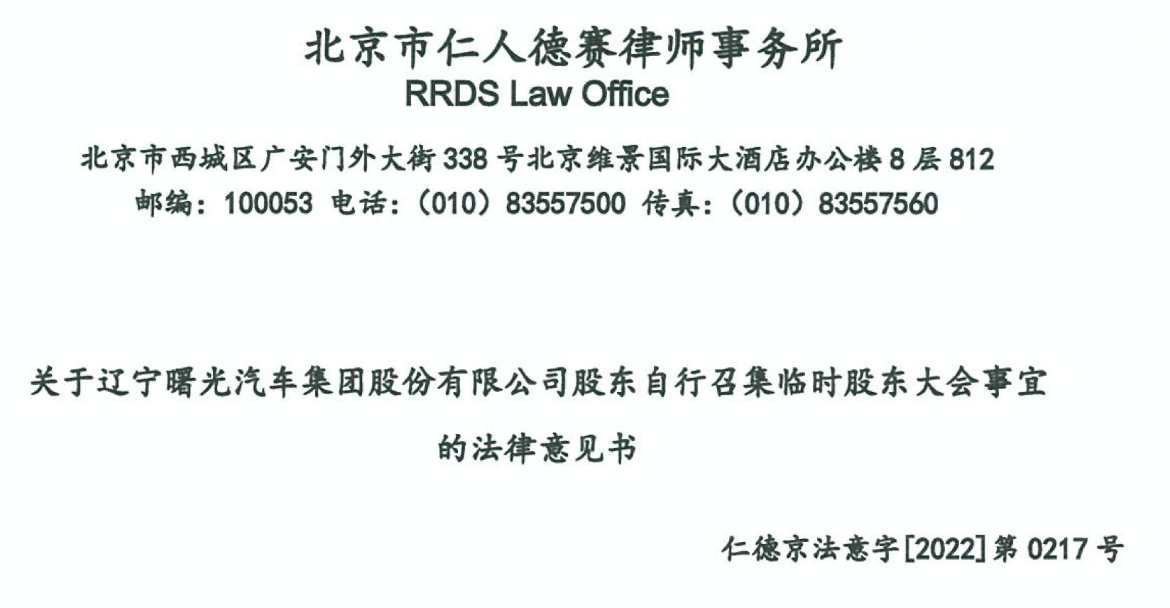 比如2022年2月21日针对股东自行召集临时股东大会事宜的“法律意见书”,就是由北京市仁人德赛律师事务所(下称仁人德赛)给出的。而不久前的2021年12月29日有关2021年第三次临时股东大会法律意见书,则是由金杜律师事务所出具。界面新闻翻阅了曙光股份近年来的法律意见书,也都是金杜律师事务所在出具。为何偏偏在自行召集临时股东大会这个事宜上,就换了律所?