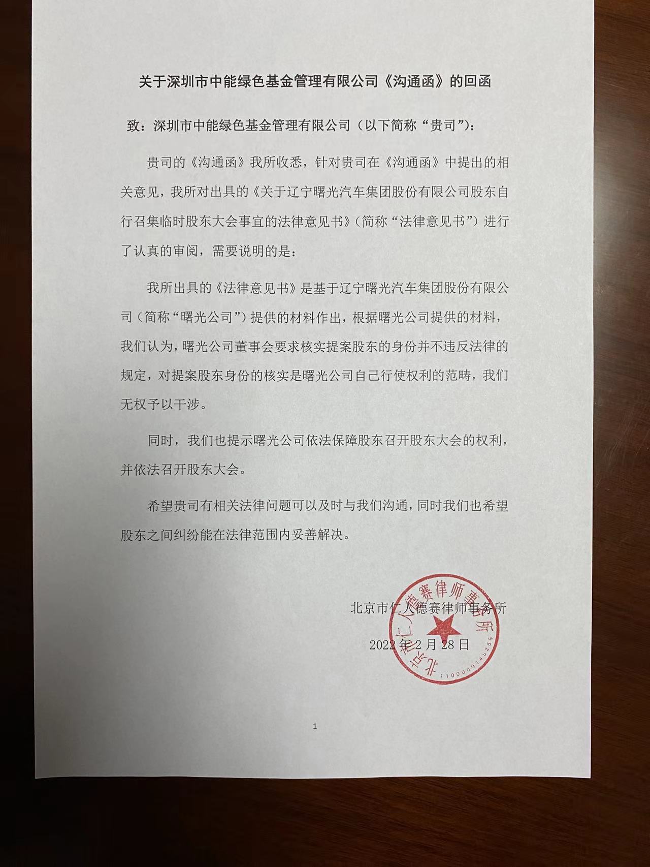 2022年1月27日,中能绿色、于晶、贾木云、姜鹏飞、李永岱、周菲等公司股东,以书面形式向董事会提交了《关于提请召集辽宁曙光汽车集团股份有限公司临时股东大会的函》及相关文件。公司认为材料不齐全并作出了回复,并表示提案股东至今未予以补正资料。