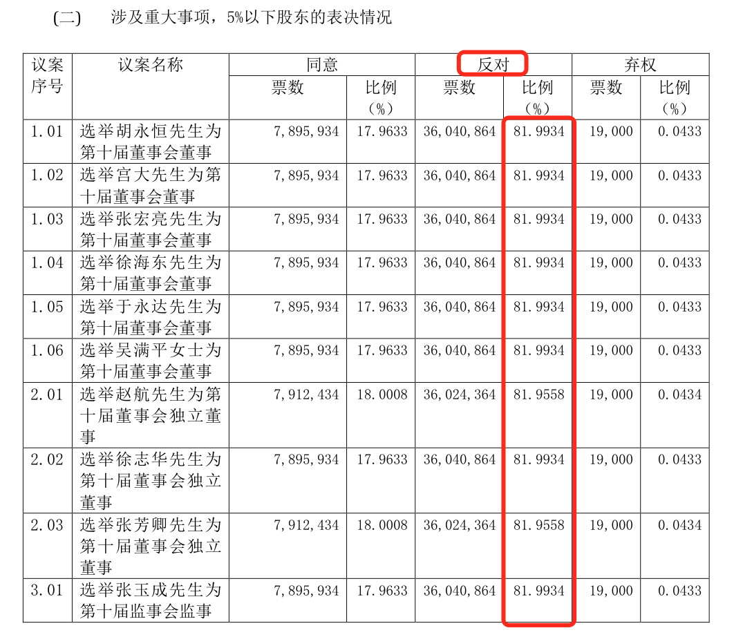 从公告看,第十届董事会、监事会选举投票中,5%以下股东的反对率是较高的。