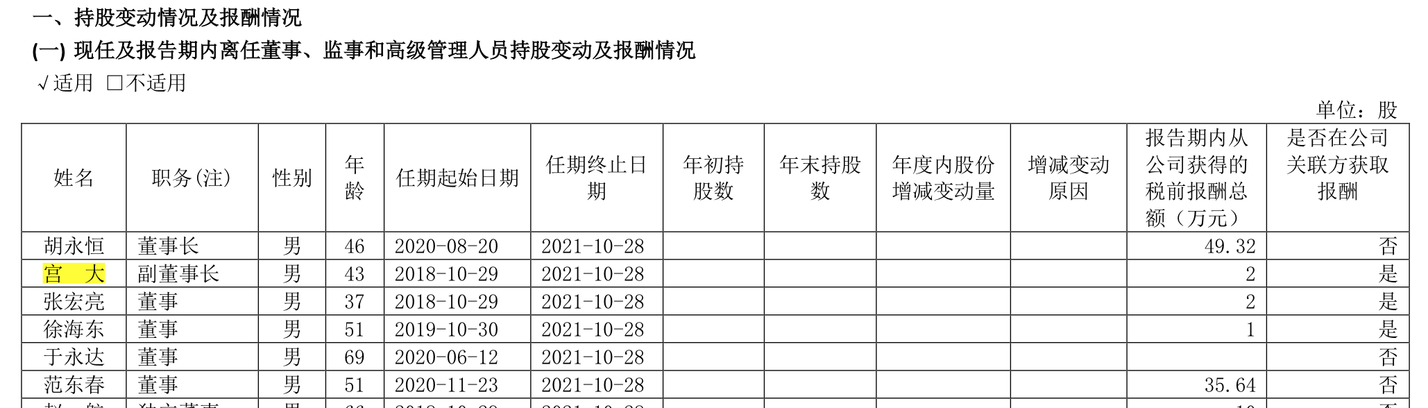 与此同时,在2020年年报中可以看到,曙光股份该年给宫大的税前报酬总额为2万元。而回避投票的张宏亮也为2万元,徐海东为1万元,于永达的报酬没有显示。