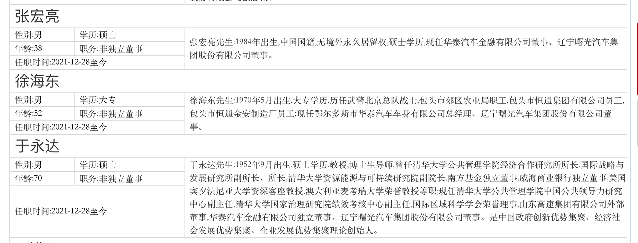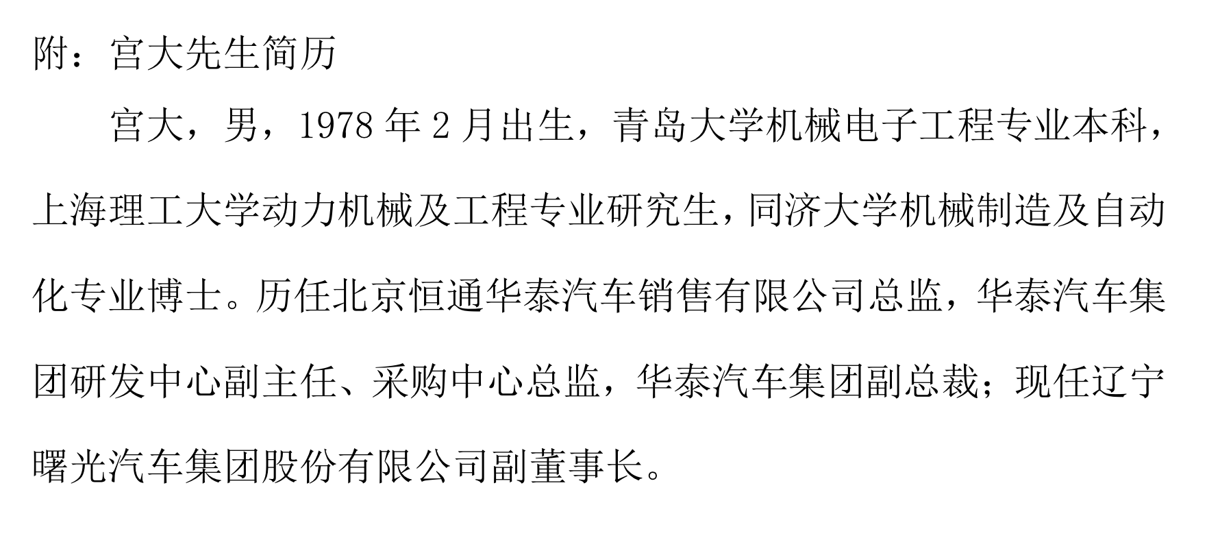 界面新闻注意到,宫大有华泰汽车集团的背景。资料显示,宫大1978年生,历任北京恒通华泰汽车销售有限公司总监,华泰汽车集团研发中心副主任、采购中心总监,华泰汽车集团副总裁,现为曙光股份的董事长。
