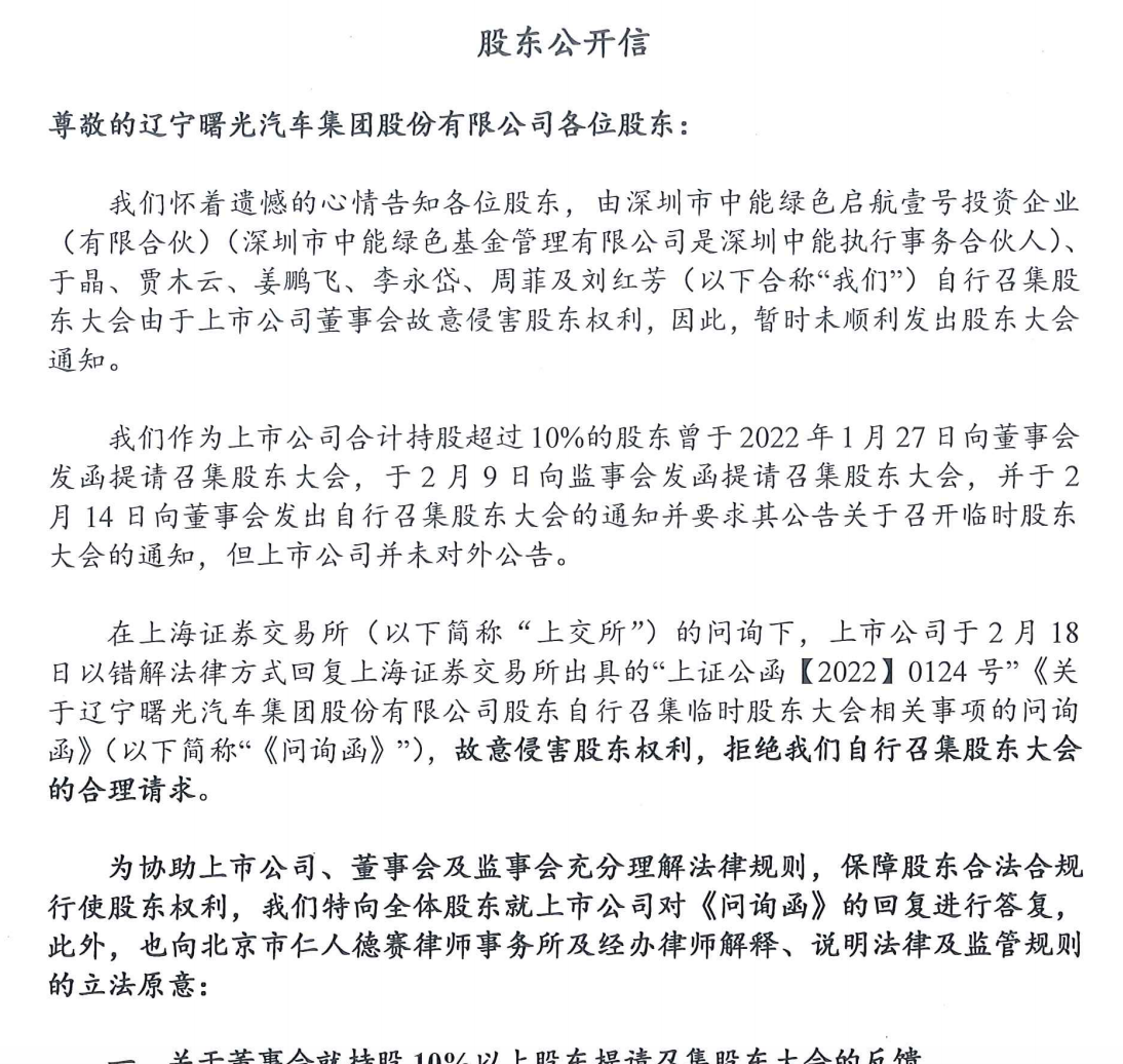 2022年2月9日,相关股东又以书面形式向公司监事会提交《关于提请召集辽宁曙光汽车集团股份有限公司临时股东大会的函》及相关文件,同样无果。