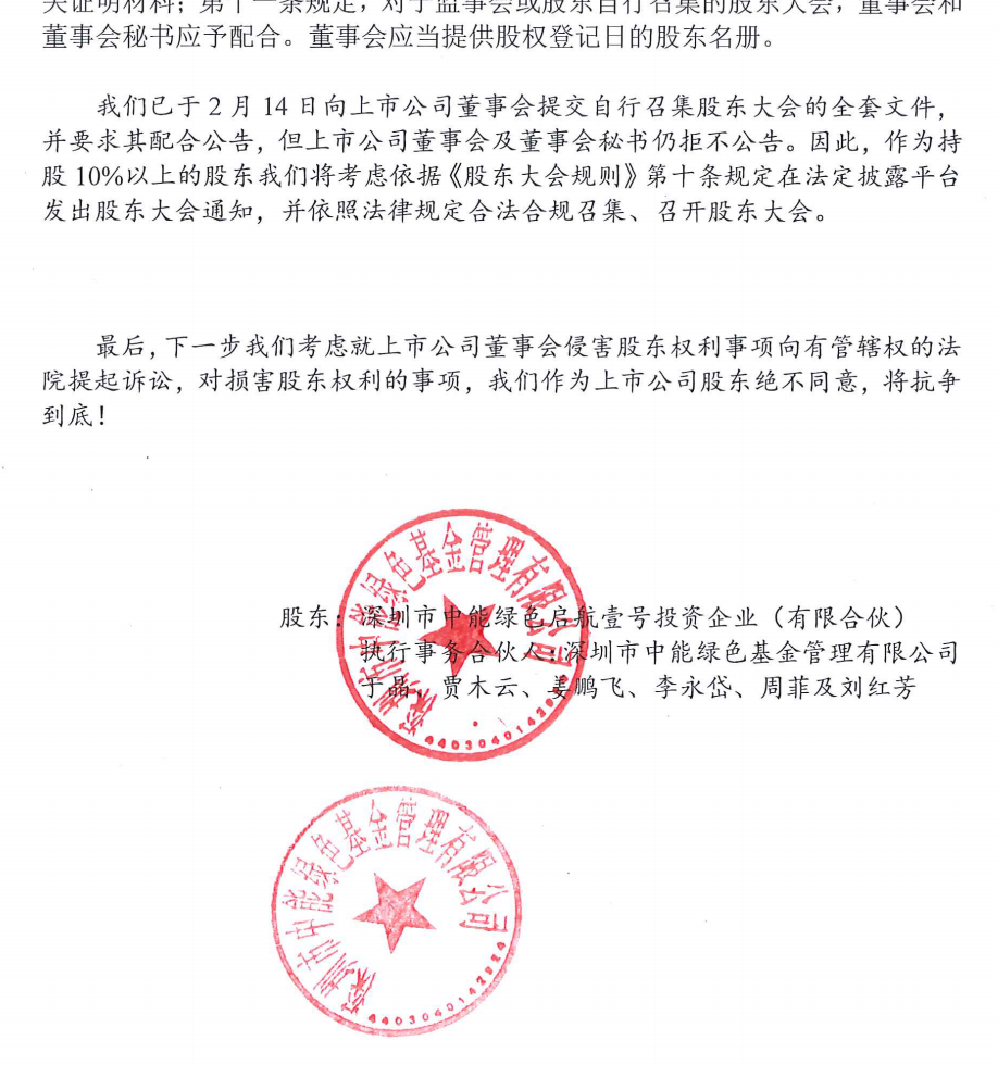 2021年12月15日,中能绿色单独向董事会书面提交增加2021年第三次临时股东大会临时提案的议案,但也在第九届董事会第四十三次会议上被否,收获了7张反对票。需要说明的是,2021年第三次临时股东大会是为了换届选举董事监事,采用非累积投票方式。而中能绿色提议用累积投票制进行选举,并增加了自己的提名候选人,其中提名了周春君、闫明、贾木云、刘全为非独立董事候选人,提名朱金淮、段新晓为独立董事候选人,提名刘建国、张国林为监事。中能绿色大有重组董事会、监事会的意思。