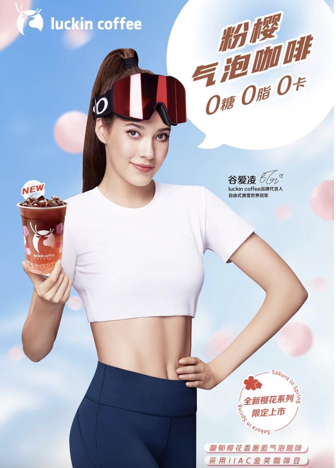 2021年,瑞幸咖啡还签约了滑雪运动员谷爱凌为代言人,这项押宝行为也为它在北京冬奥会期间获得了不少关注度。例如,借助谷爱凌的人气飙升,瑞幸咖啡在北京冬奥会期间在社交平台迅速发起大规模营销活动,相关产品卖断货。3月7日,瑞幸咖啡再次推出新品粉樱气泡咖啡,海报上仍然是谷爱凌的面孔。