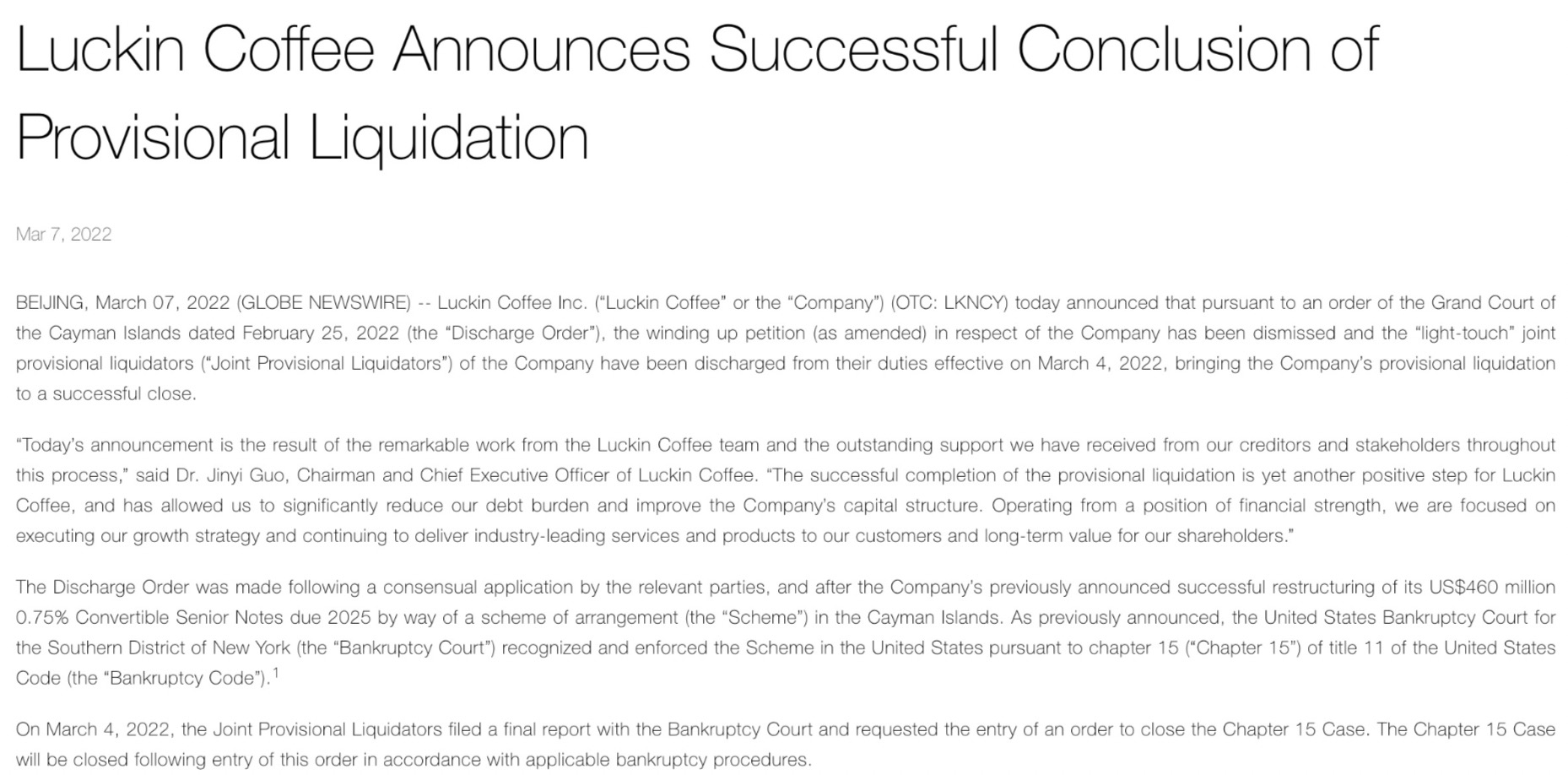 3月7日晚间,瑞幸咖啡官网宣布,根据开曼群岛大法院于2022年2月25日发出的命令(撤销令),该公司的清盘呈请已被驳回,联合临时清算人已被解除职务,自2022年3月4日起生效。该撤销令是在瑞幸咖啡4.6亿美元债券重组计划获债权人批准之后,相关各方一致申请后做出的。