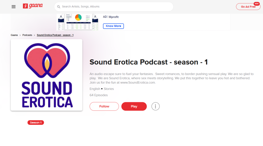 在印度最大流媒体公司Times Internet旗下音乐流媒体平台Gaana上,播客部分有一个单独的类别,叫做“爱情故事”,它不仅提供色情音频故事,甚至毫不避讳地在专辑封面上呈现裸体形象。其中一条描述写道:“在艺术、性、嬉戏、冒险和想象的推动下,《Rose &Dayv Caraway》将用爱、失去、动作、冒险、浪漫、悬疑、恐怖、科幻、超自然和幻想的淫荡故事,唤醒你的感官。”