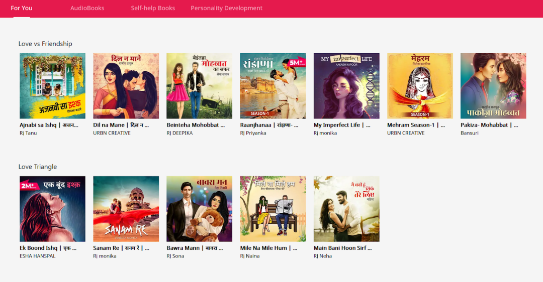 “音频平台正在效仿MX Player、Ullu和AltBalaji等平台。”孟买有声读物公司Aawaz.com的首席执行官Sreeraman Thiagarajan表示,“虽然不能确定与恐怖、幻想和历史等其他类型相比,它有多大的吸引力,但一些平台现在正以不同的角度提供此类内容;Pocket FM甚至有独立的类别,包括大学恋情、三角恋、单相思和背叛。”