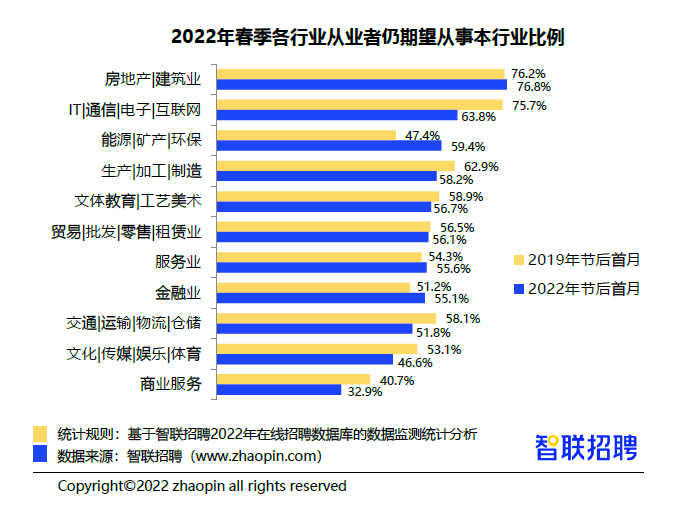 值得注意的是,互联网行业人才流动性在增大。与2019年相比,2022年春季想转行的IT互联网人才比例较2019年提高约一成,涨幅相对较大。