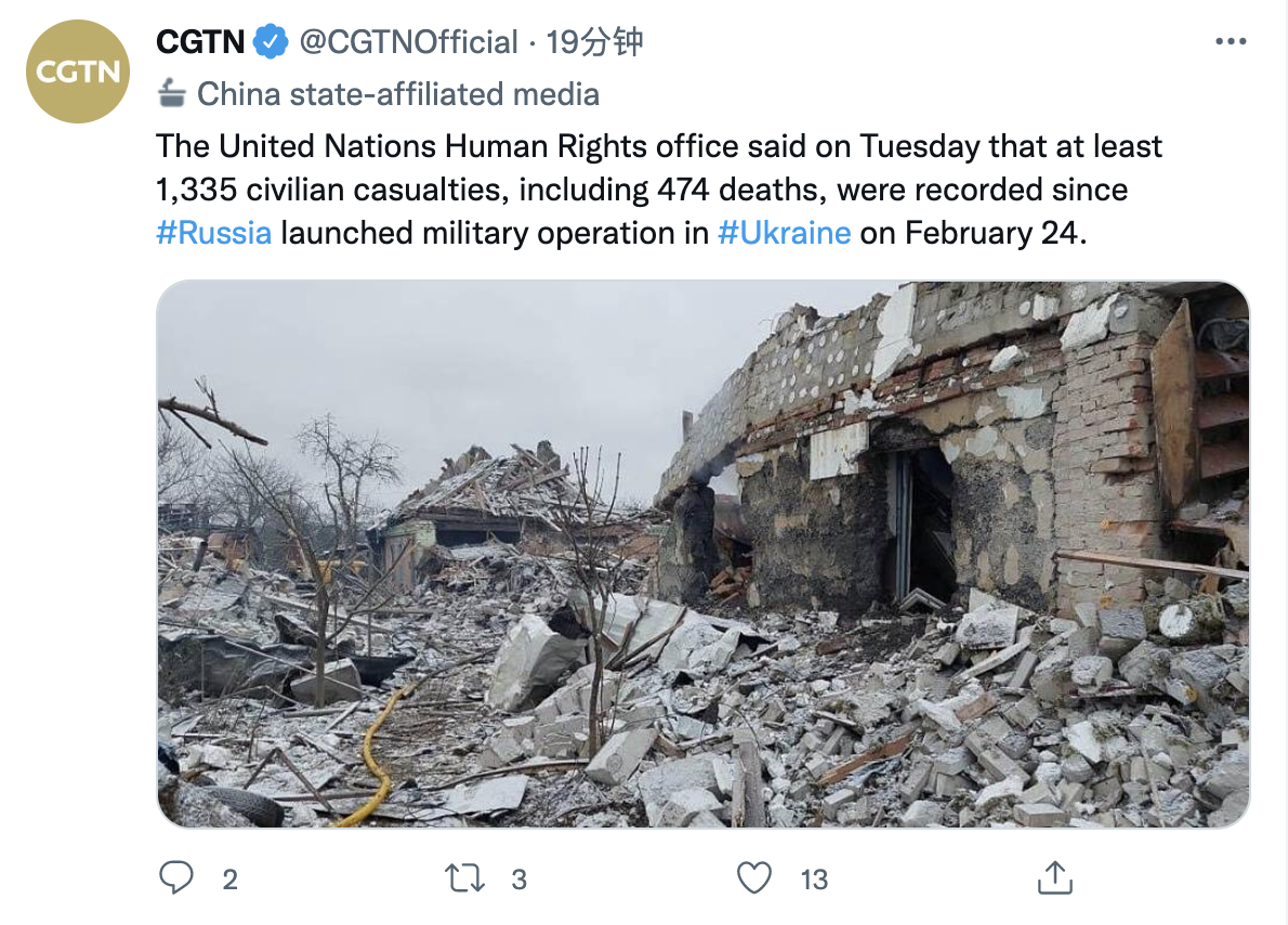 据CGTN 3月8日报道,联合国人权办公室周二表示,自俄罗斯2月24日在乌克兰发起军事行动以来,至少有1335名平民伤亡,其中474人死亡。