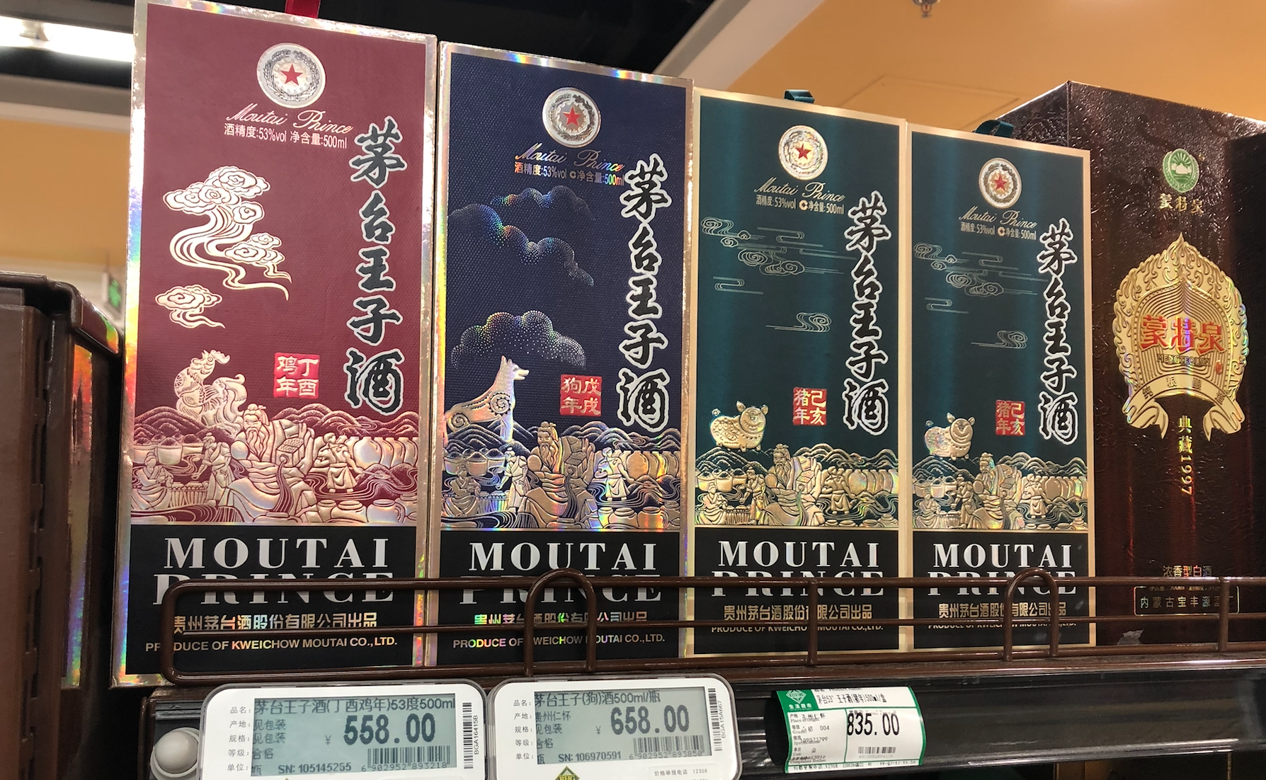 界面记者走访KA卖场渠道时发现,茅台集团子公司产品在商超货架上铺货较多。其中,以茅台王子酒、茅台迎宾酒为主,价格带跨越200元-600元不等。