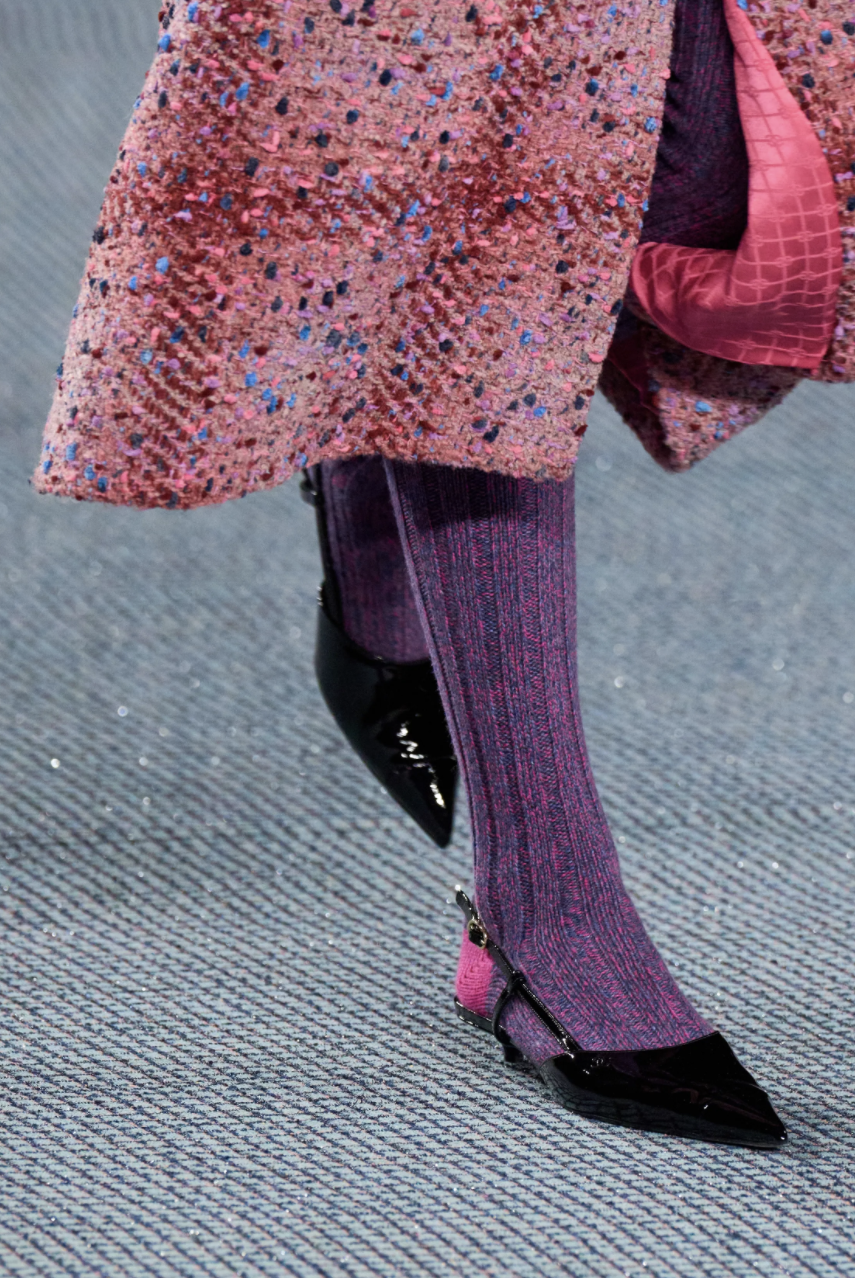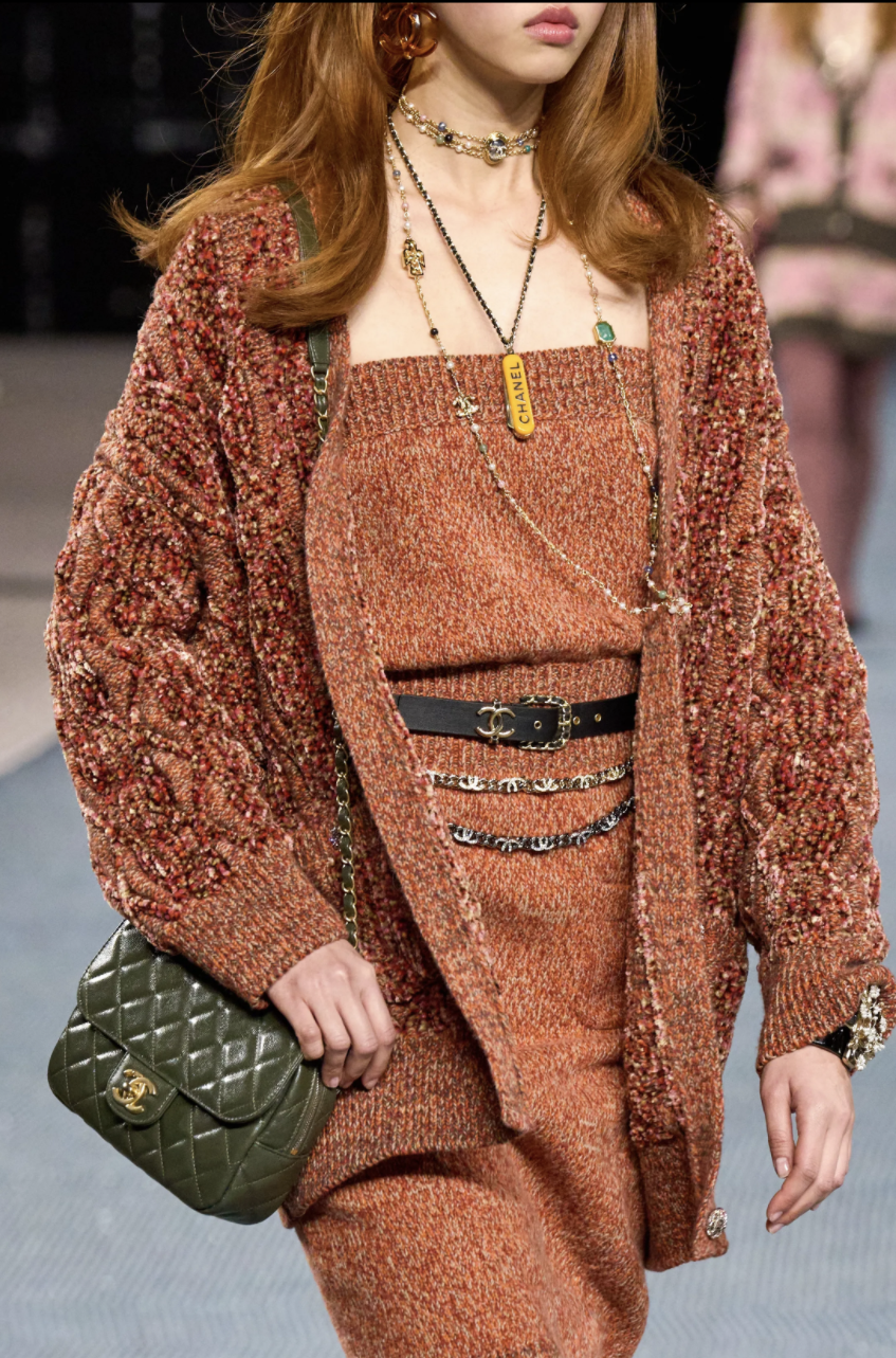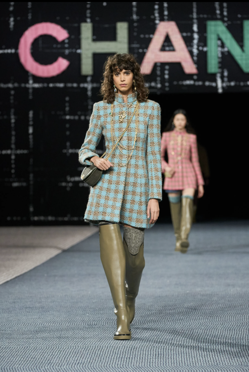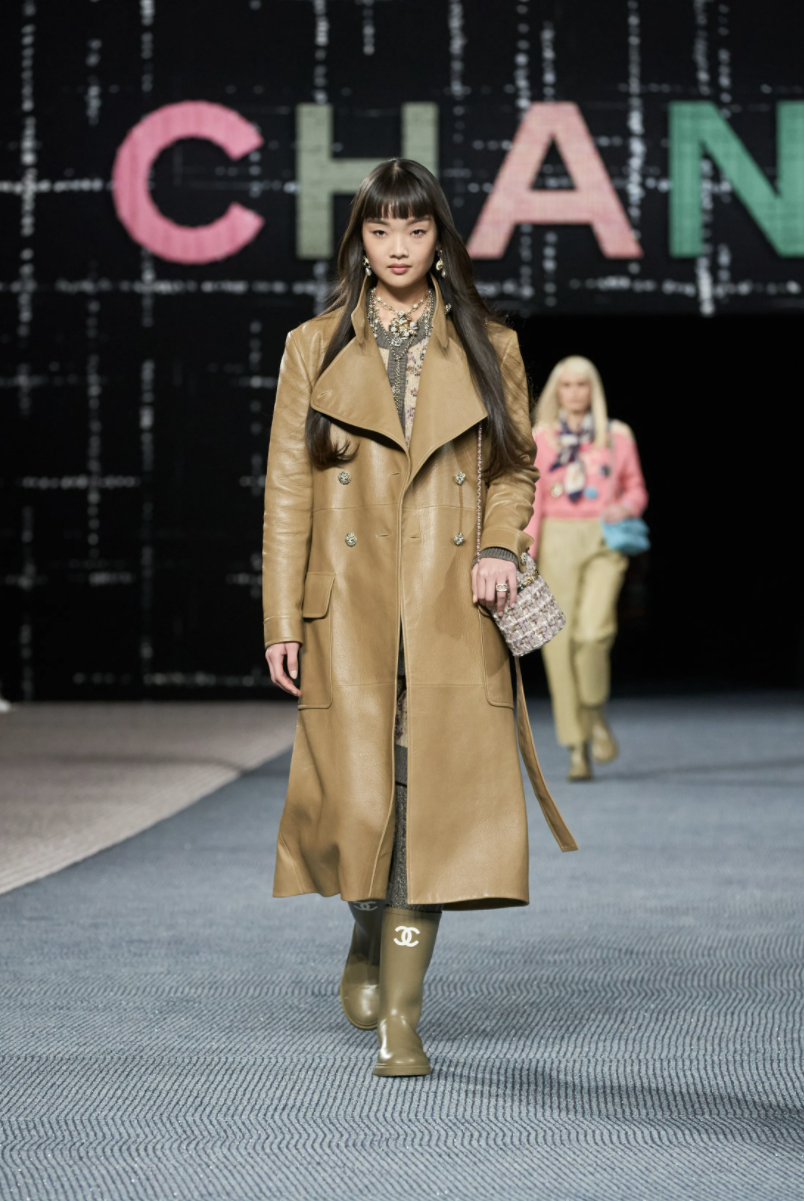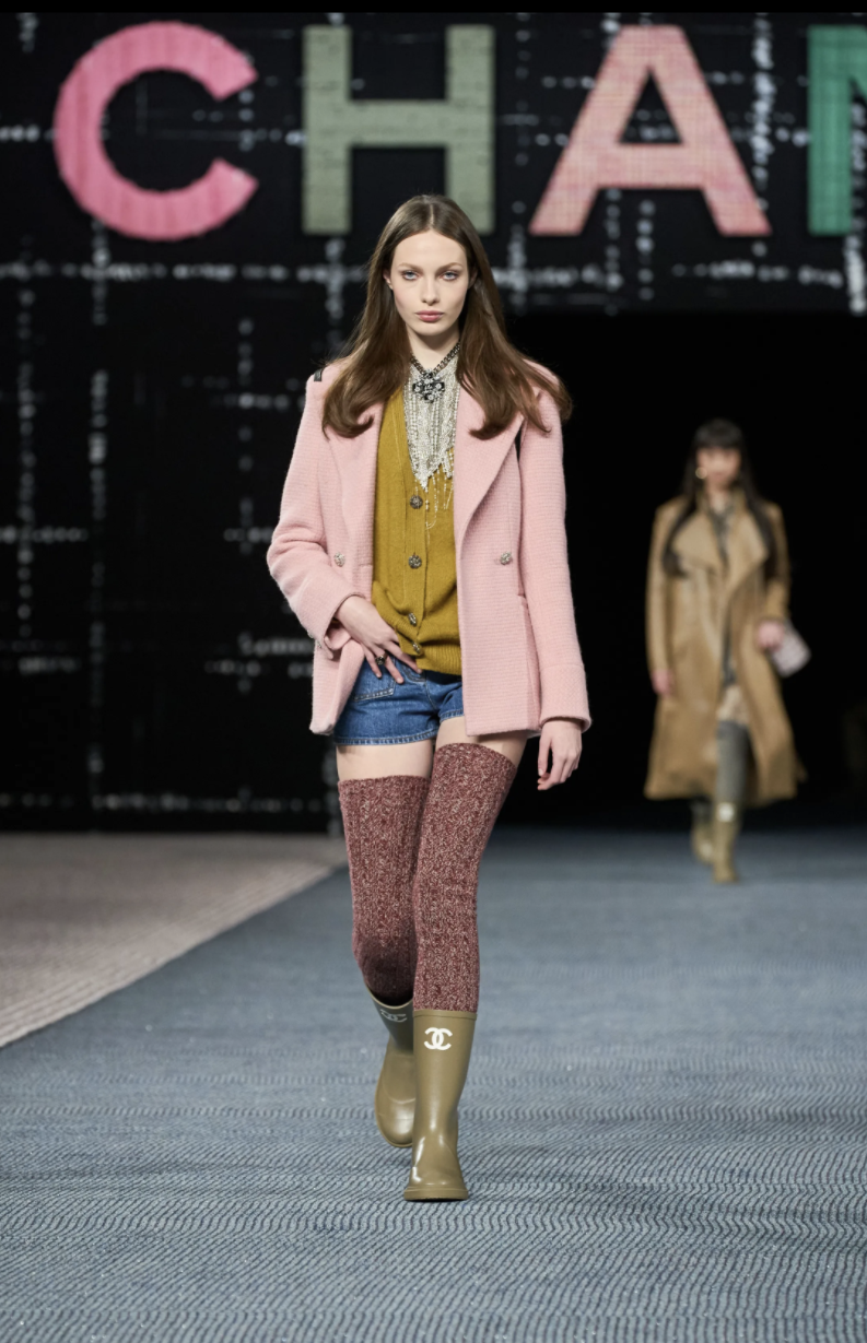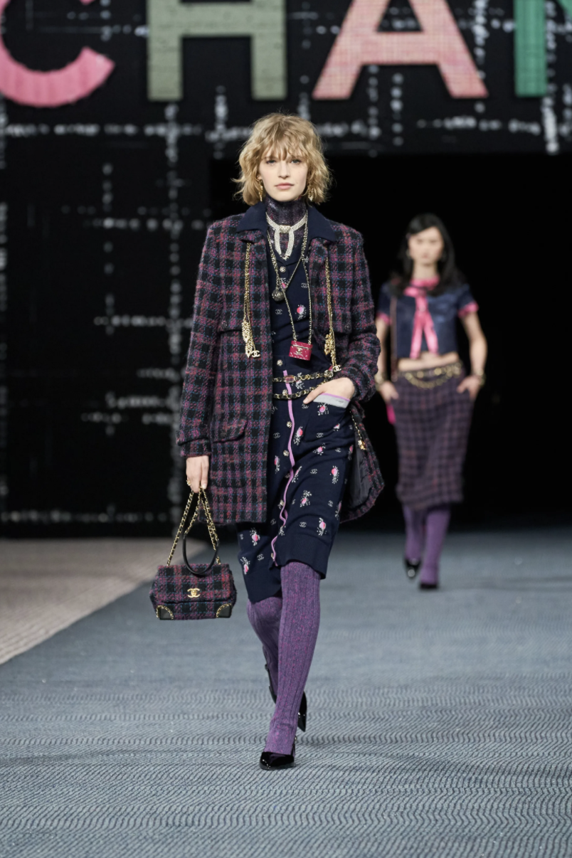 粗花呢短裤套装搭配闪亮的黑色猫跟鞋,既展现1960年代的英格兰风情又兼顾时尚范畴;Virginie Viard用五颜六色的厚罗纹紧身长袜和印有著双C标志的橡胶雨靴营造出周末度假的悠闲舒适的状态;而口袋狩猎夹克和柔软羊毛外套的灵感实则借鉴了Gabrielle Chanel从她的爱人西敏公爵那里拿来的超大号的男士夹克,Gabrielle Chanel曾说:“没有什么比穿你爱的人的衣服更性感的事了,我对这种永不过时的姿态着迷。”