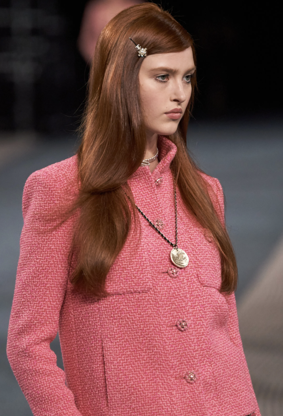 创始人Gabrielle Chanel的一次苏格兰之行,从草木风光中汲取灵感,打造出色调非凡的tweed材质。经典斜纹软呢的裙装,在剪裁上最大程度勾勒出女性身体曲线,满足时下新时代女性追求精致又舒适的渴望。粉色排扣软呢外套的曲线剪裁秉持着香奈儿从20世纪20年代起建立的风格,款式与香奈儿黑色雪尼尔套装有异曲同工之处,近看暗斜纹细腻低调,排扣以同色系花朵状镶嵌其中,体现着香奈儿对女性浪漫主义的传递。